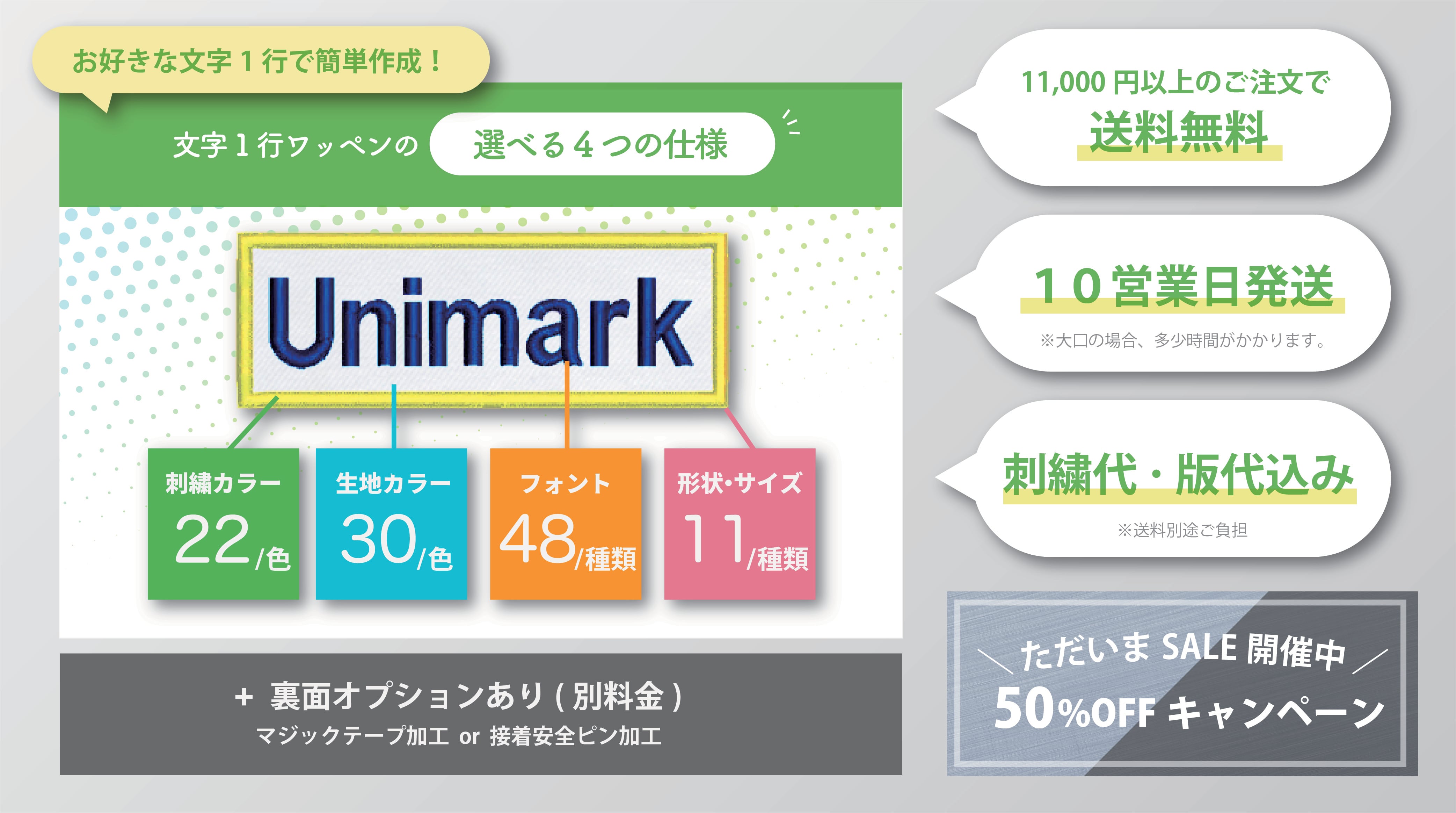 お好みの生地素材、書体、文字カラー、外枠カラーをお選びいただき